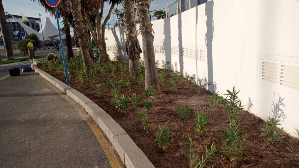 Concretamente, se han plantado Bougainvillea glabra, conocida por su floración vistosa y prolongada; Nerium oleander nana (adelfa enana), una especie de hoja perenne y flor colorida que tolera ambientes salinos; Tulbaghia violácea, valorada por su aroma y su capacidad de cubrir espacios de forma ornamental; Cyca revoluta, una planta de porte escultural muy usada en jardinería urbana; Cyrtomium falcatum, un helecho resistente que aporta verdor durante todo el año; y Pittosporum tobira, una especie muy habitual en alineaciones por su adaptación al entorno urbano y su resistencia.