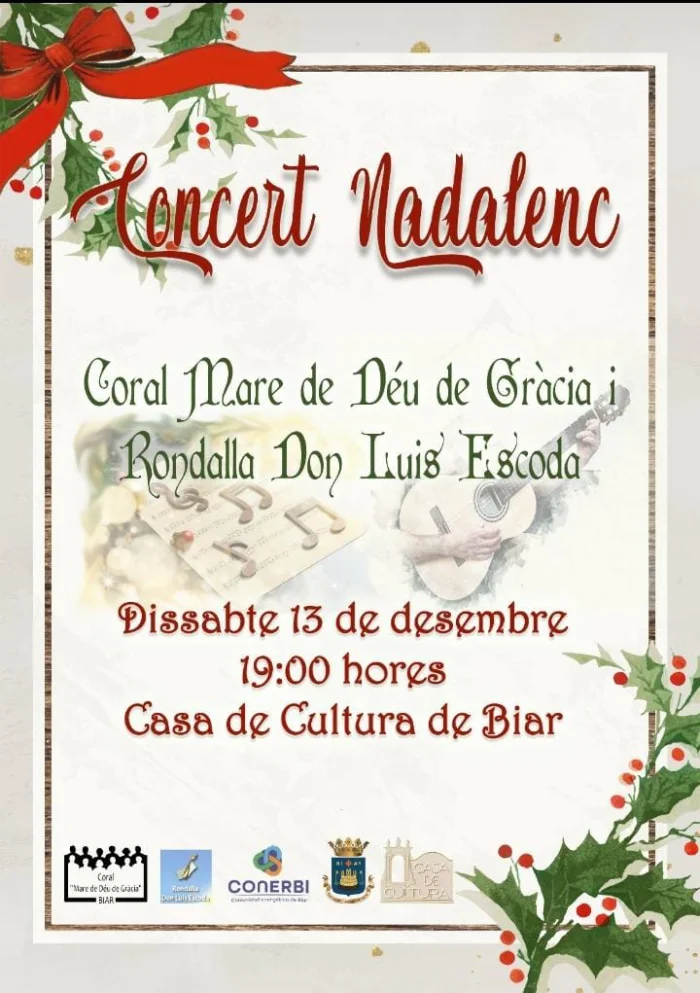 Sábado 13 de diciembre (19:00 h): La Casa de Cultura acogerá el Concierto Navideño de la Coral Mare de Déu de Gràcia y la Rondalla D. Luis Escoda.