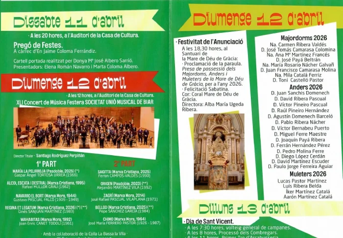 La actividad musical regresará el sábado 2 de mayo con el XVI Concierto de la Colla de Dolçaines i Tabals «La Bassa la Vila», dirigida por Jordi Sempere Azorín. En esta ocasión, la percusión y la dolçaina se unirán a los metales para interpretar piezas de compositores de la talla del biarense Ferrán Campos-Valdés y José Rafael Pascual Vilaplana, contando con directores invitados de prestigio.