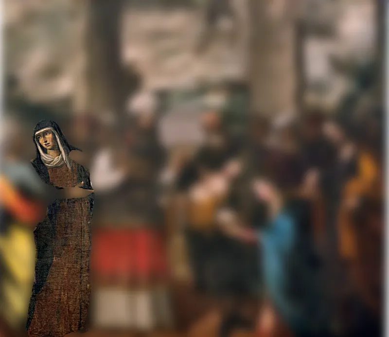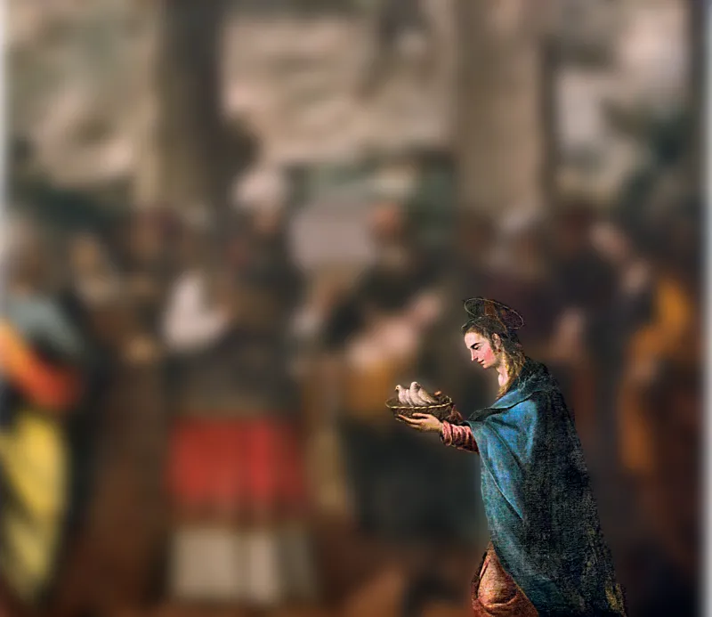 María y José acuden al templo de Jerusalén como judíos piadosos, llevando la ofrenda prescrita: dos tórtolas, gesto que subraya la sencillez y pobreza del entorno en el que se manifiesta el Mesías.