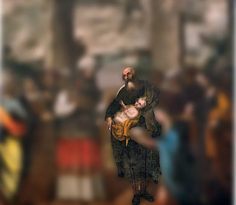 El centro compositivo lo ocupa el anciano Simeón, que toma al Niño en brazos tras reconocer en Él al Salvador prometido. Hombre justo y piadoso, había recibido la revelación de que no moriría sin ver al Mesías.