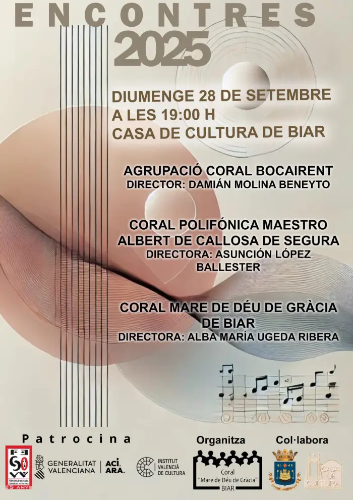 La localidad de Biar acogerá el próximo domingo 28 de septiembre de 2025 una cita ineludible para los amantes de la música coral. La Casa de Cultura de Biar será el escenario de los ya tradicionales Encuentros de Corales en Biar 2025, una jornada dedicada a la riqueza del canto polifónico.
