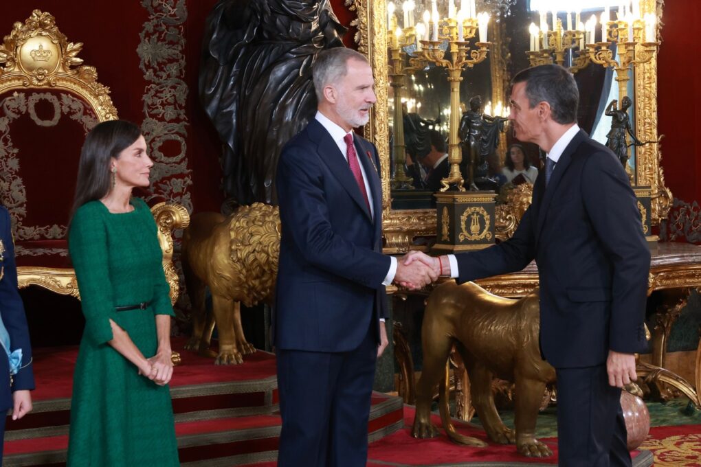 Don Felipe y Doña Letizia, acompañados de sus hijas la Princesa de Asturias y la Infanta Doña Sofía saludaron a los representantes de los Poderes del Estado, al Gobierno de España, a los altos cargos de instituciones extranjeras, a los presidentes de Comunidades Autónomas, a los expresidentes del Gobierno, al jefe de la oposición, al alcalde de Madrid, al Cuerpo Diplomático, a los ponentes de la Constitución, a los partidos políticos con representación parlamentaria, y a los miembros del Congreso de los Diputados, del Senado, del Tribunal Constitucional, del Consejo General del Poder Judicial, del Tribunal Supremo, del Consejo de Estado, del Tribunal de Cuentas, de la Fiscalía General del Estado y de la Oficina del Defensor del Pueblo, así como del resto de los asistentes, procedentes de distintas esferas sociales de la vida pública nacional.