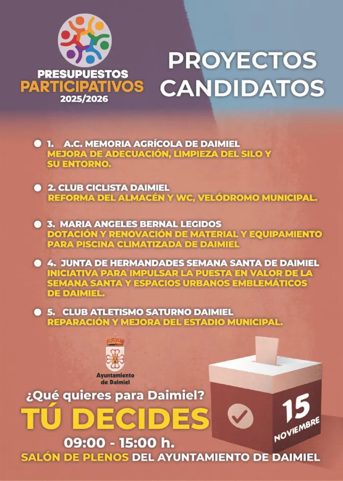 Los ciudadanos de Daimiel tendrán la oportunidad de elegir su proyecto favorito el próximo sábado 15 de noviembre entre las cinco propuestas que han superado el filtro técnico para los Presupuestos Participativos de 2025. Con una dotación total de 31.549 euros, las iniciativas van desde mejoras en infraestructuras deportivas hasta la puesta en valor del patrimonio local.