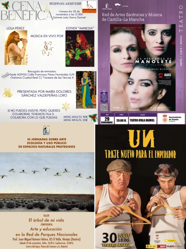 El municipio de Daimiel cierra el mes de noviembre con un fin de semana cargado de eventos que combinan solidaridad, reconocimiento empresarial, cultura y conciencia ecológica. La agenda se intensifica con propuestas que van desde una cena benéfica y la entrega de los prestigiosos Premios Empresariales de AEDA, hasta una doble representación teatral y unas jornadas dedicadas al arte y la ecología.
