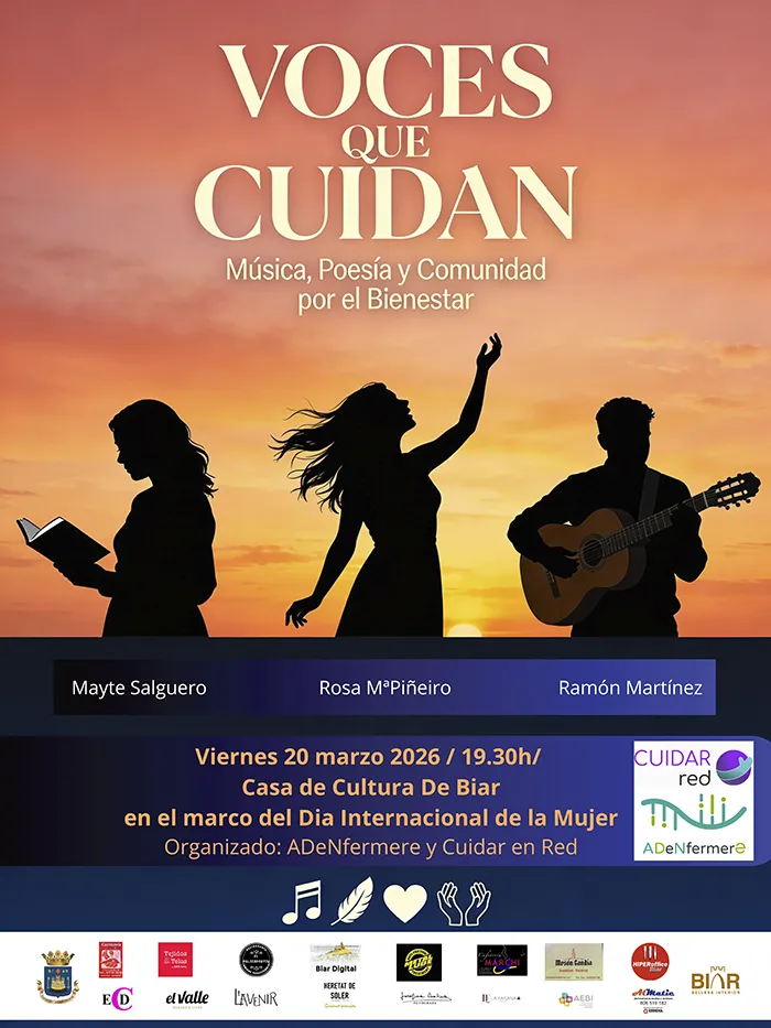 La cita tendrá lugar el próximo viernes 20 de marzo de 2026, a las 19:30 h, en la Casa de Cultura de Biar. Organizado por las entidades ADeNfermer@ y Cuidar en Red, el encuentro se integra en la programación del Día Internacional de la Mujer, subrayando el papel histórico y esencial de las mujeres en el ámbito de los cuidados.