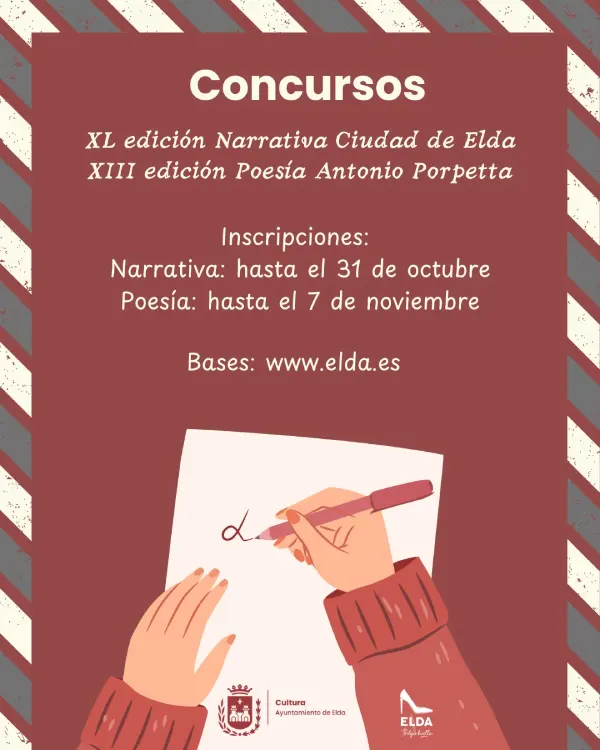 El Ayuntamiento de Elda, a través de la Concejalía de Cultura, ha hecho públicas las bases de dos de sus certámenes literarios más emblemáticos: la XL edición del Concurso de Narrativa ‘Ciudad de Elda’ y la XIII edición del Concurso de Poesía ‘Antonio Porpetta’ para jóvenes poetas. Ambos concursos no solo mantienen su celebración, sino que incrementan sus premios, reforzando así el apoyo municipal al talento literario.