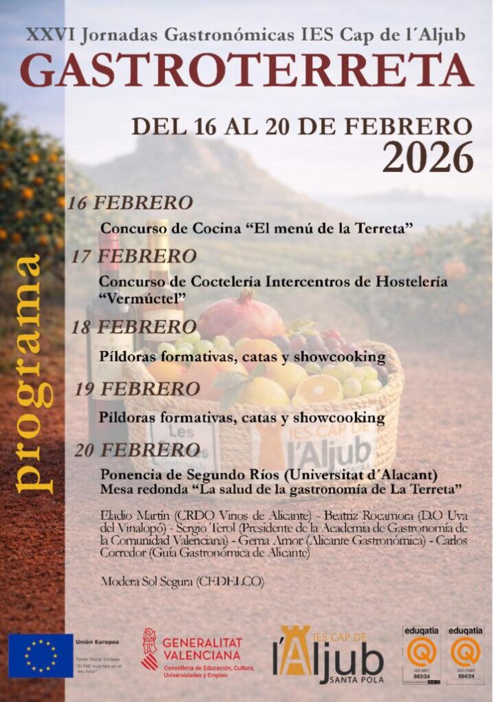 Del 16 al 20 de febrero se celebra la vigésimosexta edición de las Jornadas Gastronómicas del IES Cap de l’Aljub de Santa Pola, un centro que el concejal de Educación, Óscar Valenzuela, ha calificado como “referente provincial gracias al gran trabajo de todo el equipo de este instituto”.