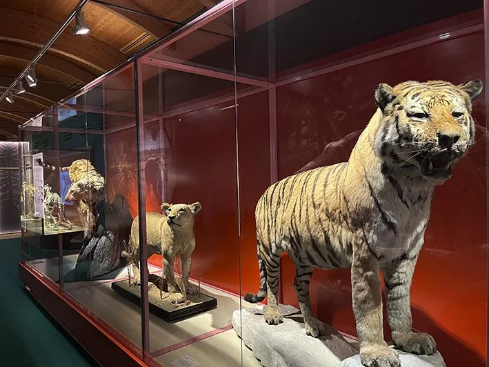 La exposición subraya que los popularmente llamados “tigres dientes de sable” no fueron un único animal, sino una familia evolutiva diversa que abarcó desde las primeras especies del Mioceno hasta los icónicos Smilodon del Pleistoceno americano. Entre las piezas más destacadas se encuentra la réplica de un hallazgo asombroso: un cachorro de Homotherium (una de las últimas especies) que fue descubierto congelado y excepcionalmente conservado en el permafrost siberiano.