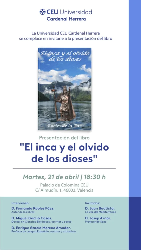 VALENCIA – El próximo martes 21 de abril, el Palacio de Colomina, sede cultural de la Universidad CEU Cardenal Herrera, se vestirá de gala para acoger la puesta de largo de la última obra de Fernando Robles Páez: El inca y el olvido de los dioses.