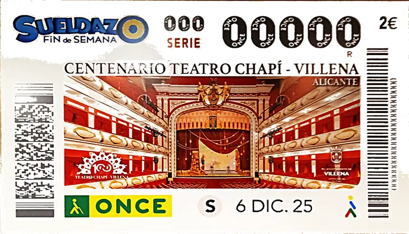 El Teatro Chapí de Villena se viste de gala para celebrar su centenario (1925-2025) con un reconocimiento muy especial: la ONCE (Organización Nacional de Ciegos Españoles) dedicará el cupón de su sorteo del próximo 6 de diciembre a conmemorar la efeméride.