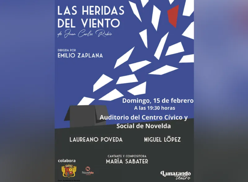 Novelda – 15 de febrero de 2026 | El próximo domingo 15 de febrero, las tablas del Centro Cívico y Social de Novelda se vestirán de gala para recibir una de las piezas más conmovedoras del dramaturgo Juan Carlos Rubio: “Las heridas del viento”. La representación, que dará comienzo a las 19:30 h, promete ser una de las citas ineludibles de la agenda cultural de este mes.