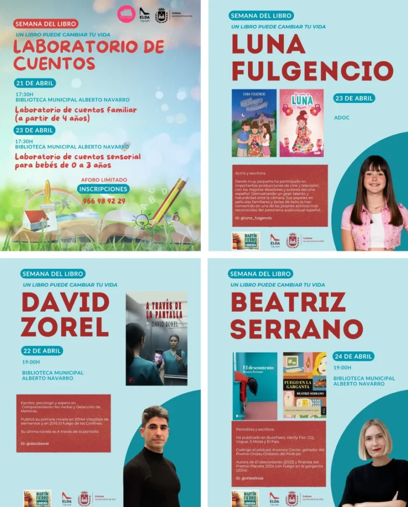 • 23 de abril: Coincidiendo con el Día Internacional del Libro, la joven actriz y escritora Luna Fulgencio compartirá su experiencia con los lectores.