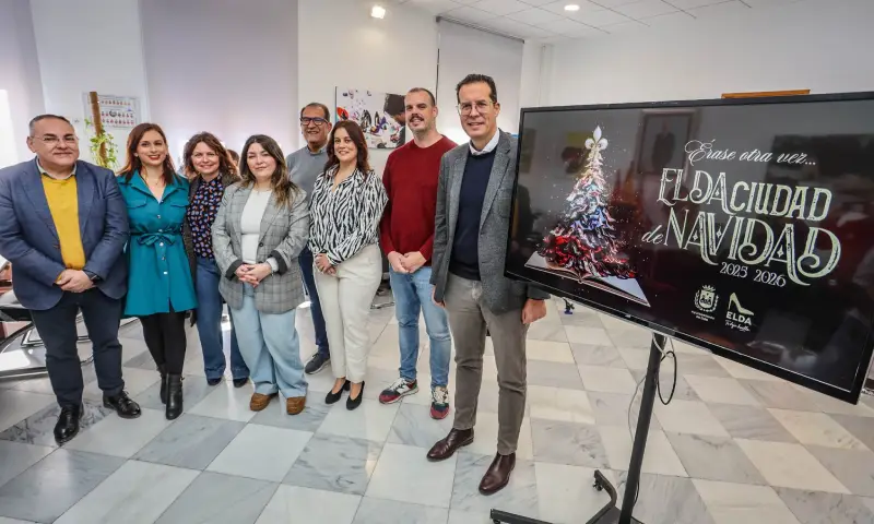 El alcalde Rubén Alfaro, acompañado por los concejales de las áreas implicadas, presentó hoy el cartel de la Navidad Eldense 2025, que este año se presenta bajo el lema ‘Érase otra vez… Elda, ciudad de Navidad’, buscando reforzar una imagen ya consolidada y reconocida por la ciudadanía.