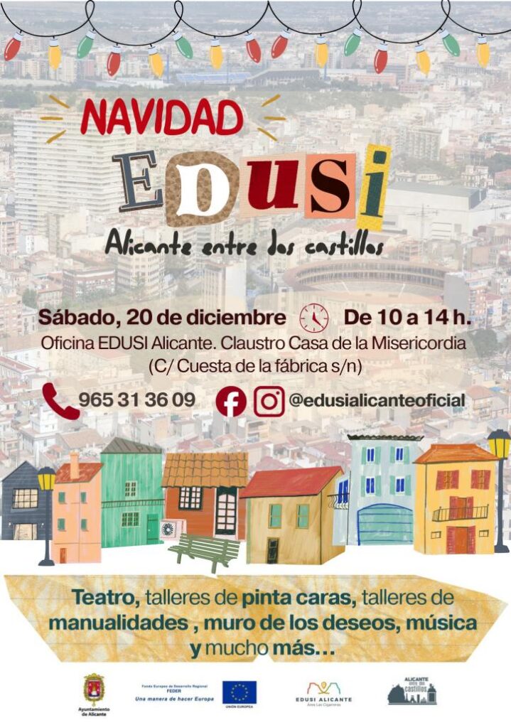 La concejalía de Planes Estratégicos y Proyectos Europeos del Ayuntamiento de Alicante, a través de la Oficina Edusi entre dos castillos, ha organizado una decena de propuestas para todos los públicos esta Navidad con festivales de villancicos, un mercadillo navideño, fiestas infantiles, talleres y una carrera solidaria que se van a desarrollar durante todo el mes de diciembre.