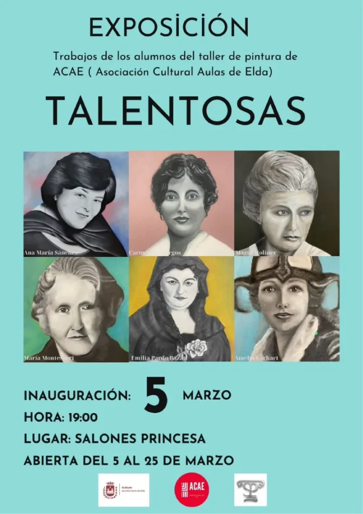 ELDA | La cultura eldense se viste de gala para rendir homenaje a las mujeres que marcaron la historia. La esperada exposición ‘Talentosas’, una iniciativa de la Asociación Cultural Aulas de Elda (ACAE), abrirá finalmente sus puertas este jueves, 5 de marzo, bajo un nuevo escenario: los emblemáticos Salones Princesa.