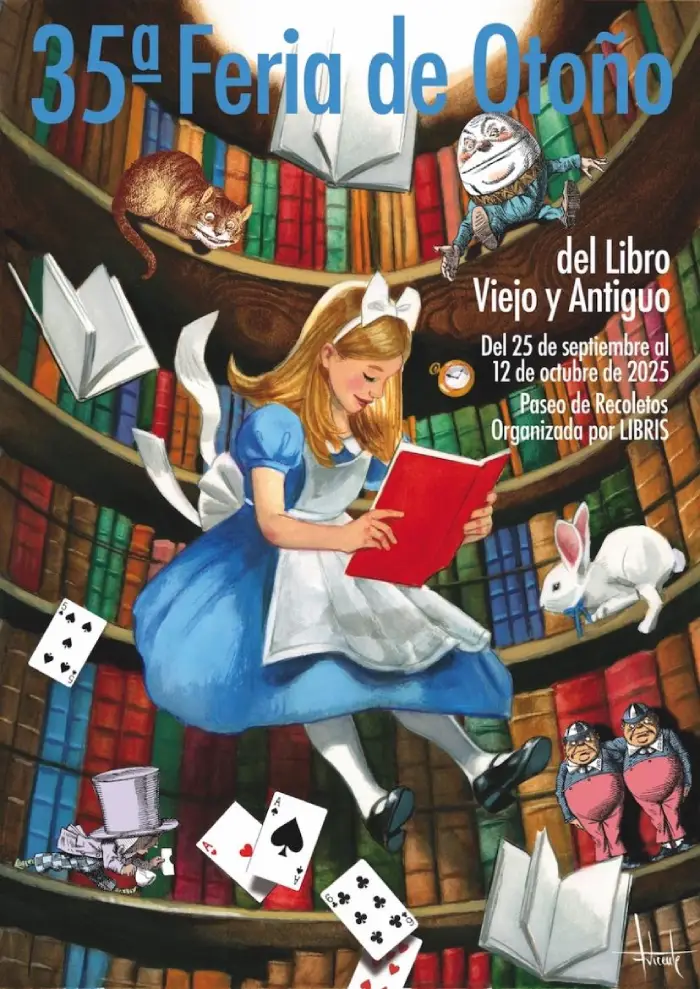 El cartel de este año, diseñado por el aclamado ilustrador Fernando Vicente, rinde homenaje al 160 aniversario de la icónica obra de Lewis Carroll, «Alicia en el país de las maravillas«. Los interesados también podrán adquirir una baraja ilustrada de literatura universal, creada por el mismo artista, en la caseta de información.