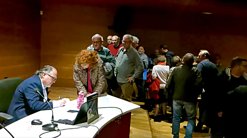 Tras la charla, se formó una larguísima cola de lectores que aguardaban pacientemente para que el autor les dedicara su ejemplar. Mientras tanto, el resto de los asistentes disfrutó de un vino de honor y un tentempié en el descansillo del auditorio, comentando los detalles de una jornada que ya se recuerda como un hito cultural para Sax.