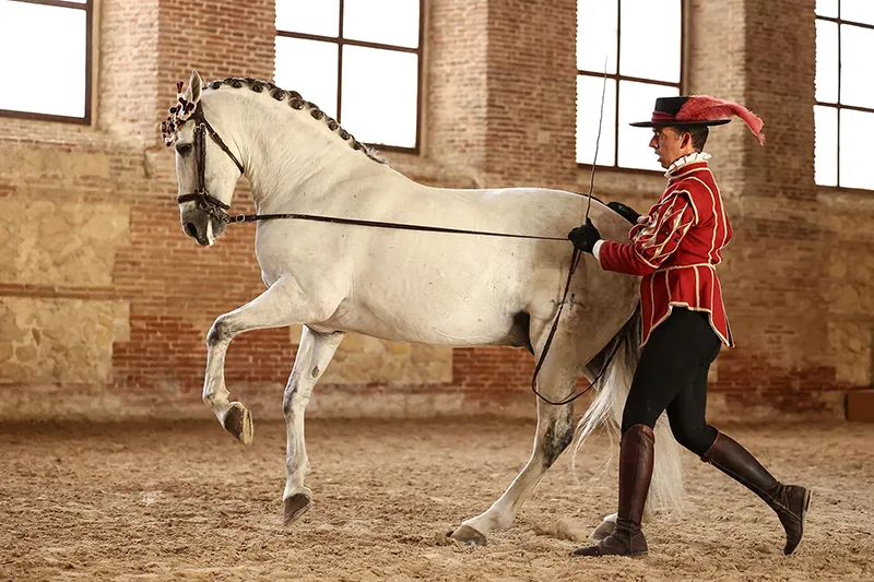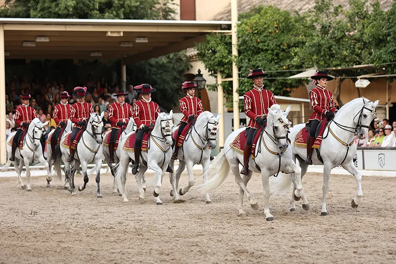 El espectáculo «Pasión y Duende del Caballo Andaluz» no es solo una exhibición técnica; es un viaje sensorial. A través de las distintas disciplinas de doma, el espectador es testigo de una conexión casi mística entre jinete y montura, alcanzando su clímax cuando el baile flamenco de una bailaora cordobesa entra en escena para dialogar, paso a paso, con la majestuosidad del caballo.