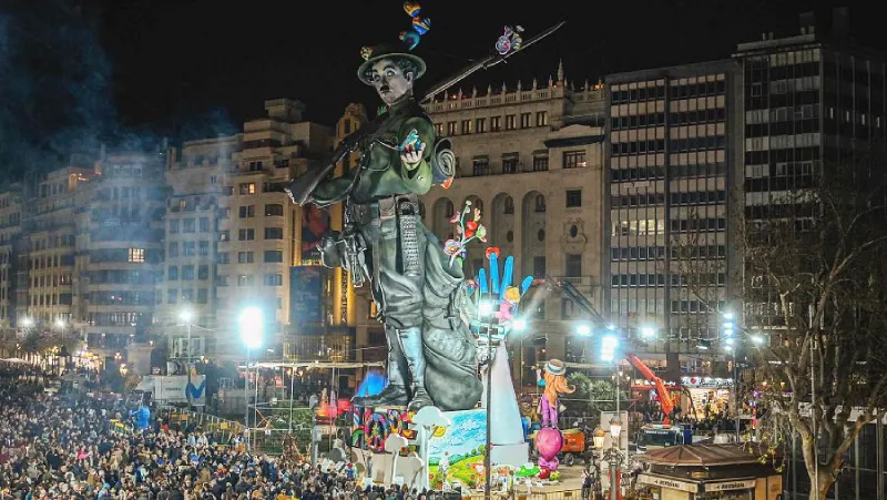 Este año, el monumento oficial —obra de los artistas Alejandro Santaeulalia y Vicente Llácer— lanza un potente mensaje global. Con un Charlie Chaplin vestido de militar como figura central, la falla se presenta como un alegato contra la guerra, rematado con la palabra “hope” (esperanza) en su base. Los propios artistas falleros participarán en el especial para desgranar los detalles de su creación antes de que sea consumida por el fuego.