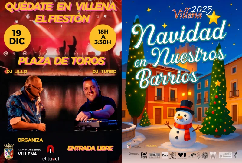 La gran novedad de esta edición llega con dos eventos musicales de entrada libre. La Plaza Plurifuncional será el escenario de ‘El Fiestón, quédate en Villena’ el 19 de diciembre. El evento, pensado para el público general y joven, contará con la actuación de los Dj’s Lillo y Turbo desde las 18:00 horas hasta la madrugada.