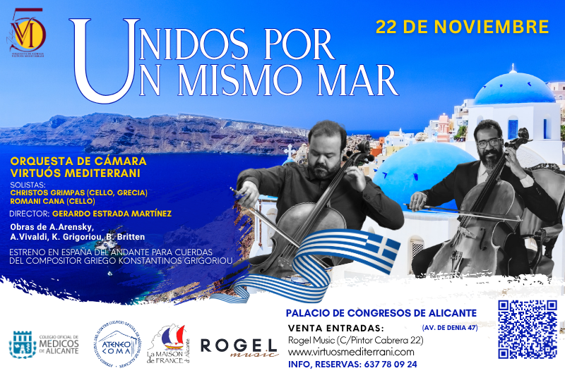 «UNIDOS POR UN MISMO MAR» es el título que la orquesta le ha dado a esta cita con marcado aroma mediterráneo, un repertorio variado y entretenido, a la vez que profundo y exigente y que se llevará a cabo en el Palacio de Congresos de Alicante. Las entradas ya están a la venta: www.virtuosmediterrani.com Rogel Music: C/Pintor Cabrera 22 Info y venta: 637 78 09 24 Te esperamos!!
