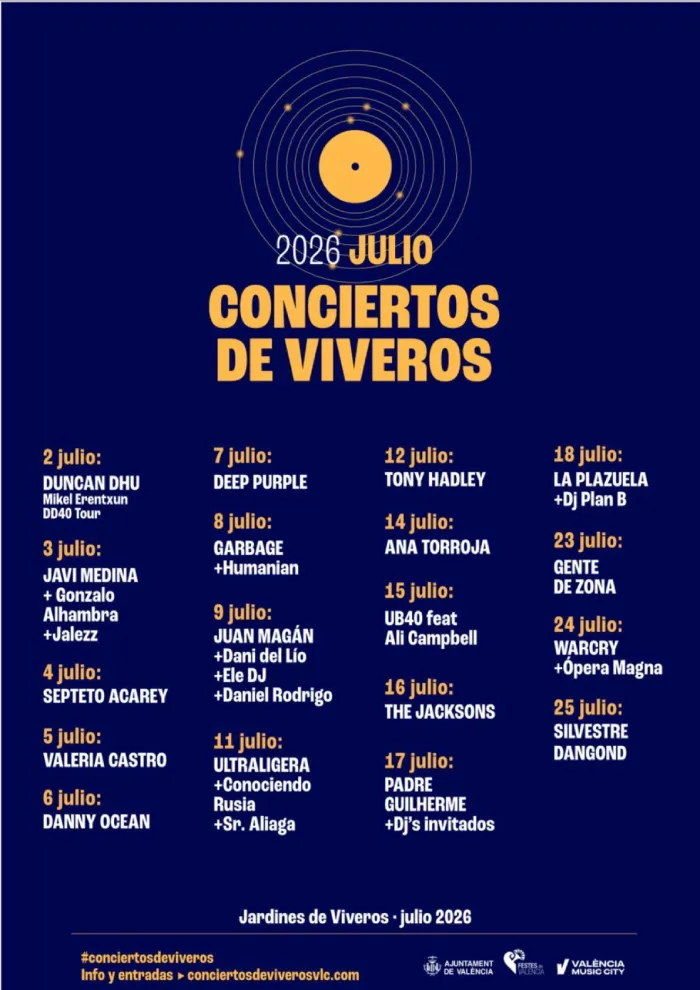 VALENCIA | 08/02/2026 El emblemático Jardín de Viveros volverá a vibrar este verano. La edición de los Conciertos de Viveros 2026 ya es una realidad tras la presentación oficial del cartel este viernes, una propuesta ambiciosa que contará con 18 noches de música en directo y la participación de 34 artistas de calado internacional y nacional.