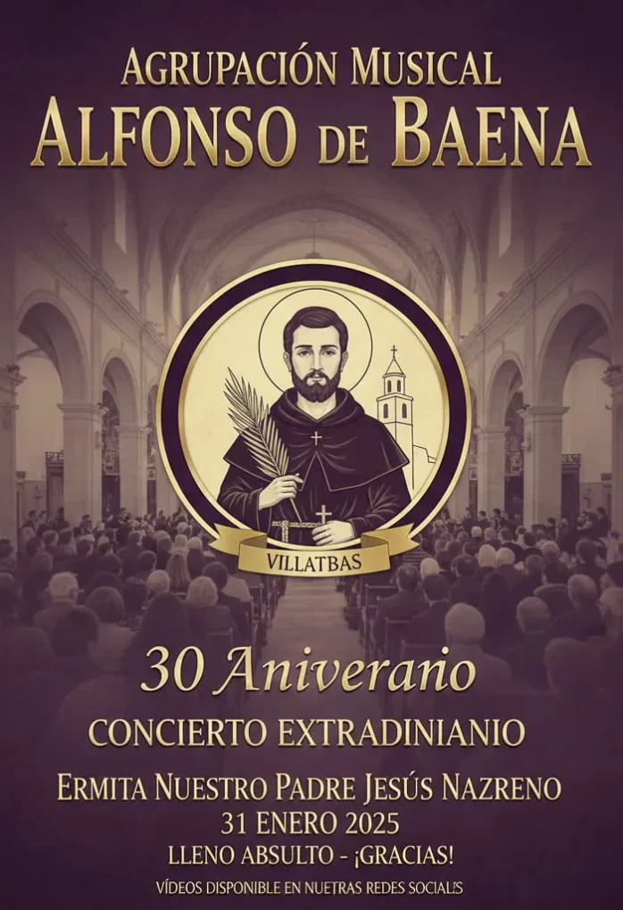 El concierto no fue solo una mirada al futuro, sino también un profundo reconocimiento al pasado. Entre los acordes de marchas clásicas como La Saeta, el guion del evento —leído por uno de los propios músicos— rindió homenaje a la figura del Beato Alfonso de Baena, quien da nombre a la formación y vincula la identidad del grupo con la historia del pueblo.