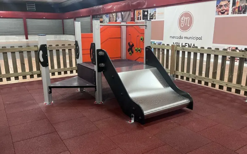 Con esta actuación, Villena dota al Mercado Municipal de un área de ocio infantil completamente renovada, más moderna, segura y accesible, mejorando así los servicios y la experiencia para los ciudadanos que acuden a este punto neurálgico del comercio local.