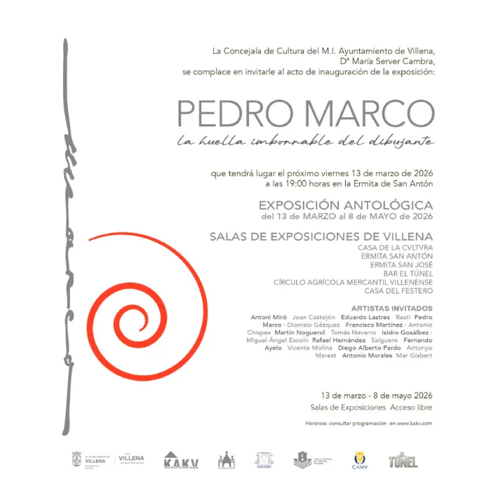VILLENA | 11 de marzo de 2026 — Villena no solo recuerda a Pedro Marco; a partir de este viernes, la ciudad se convierte en su lienzo. Bajo el título ‘Pedro Marco, la huella imborrable del dibujante’, el M.I. Ayuntamiento y la Casa de la Cultura (KAKV) han orquestado un ambicioso proyecto expositivo que trasciende las paredes de un museo para ocupar seis espacios emblemáticos de la localidad.