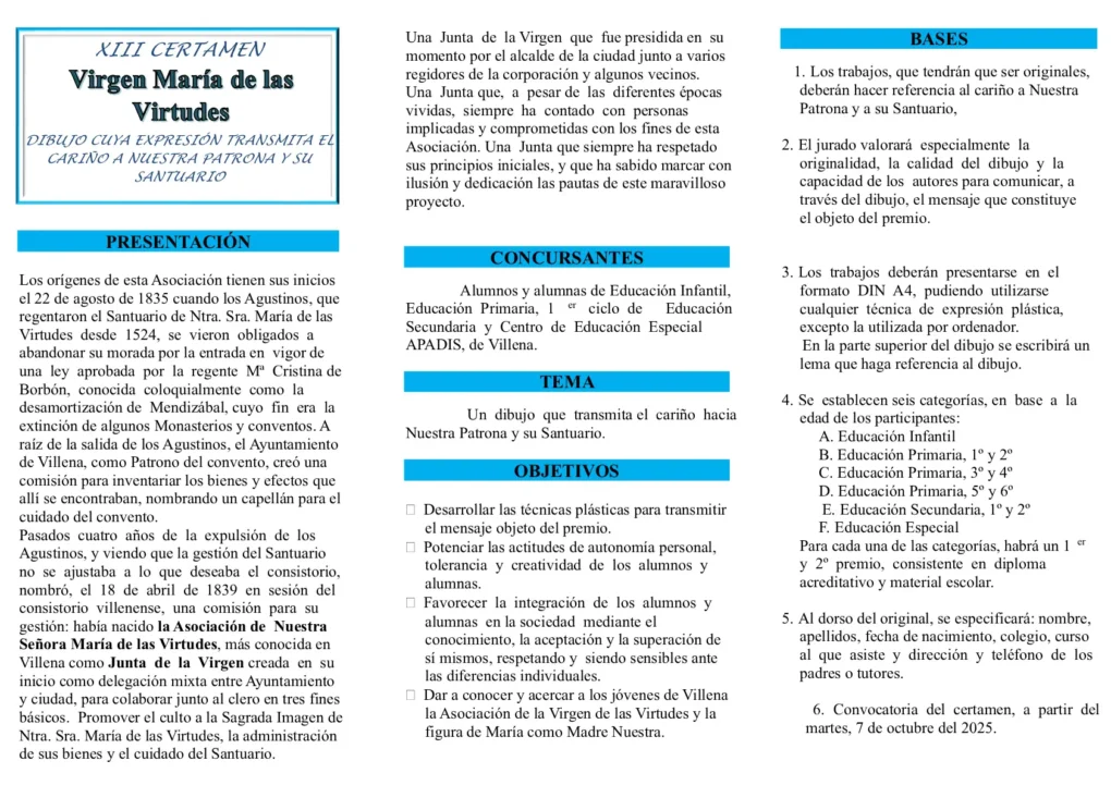 El certamen es una iniciativa clave de la Junta de la Virgen para fomentar la creatividad y, al mismo tiempo, acercar a los más jóvenes a la figura de su patrona, la «Morenica», y a los valores de las Virtudes que representa. La organización ha invitado a los jóvenes a leer atentamente las bases que se adjuntarán a la publicación y a participar activamente en esta consolidada cita artística.